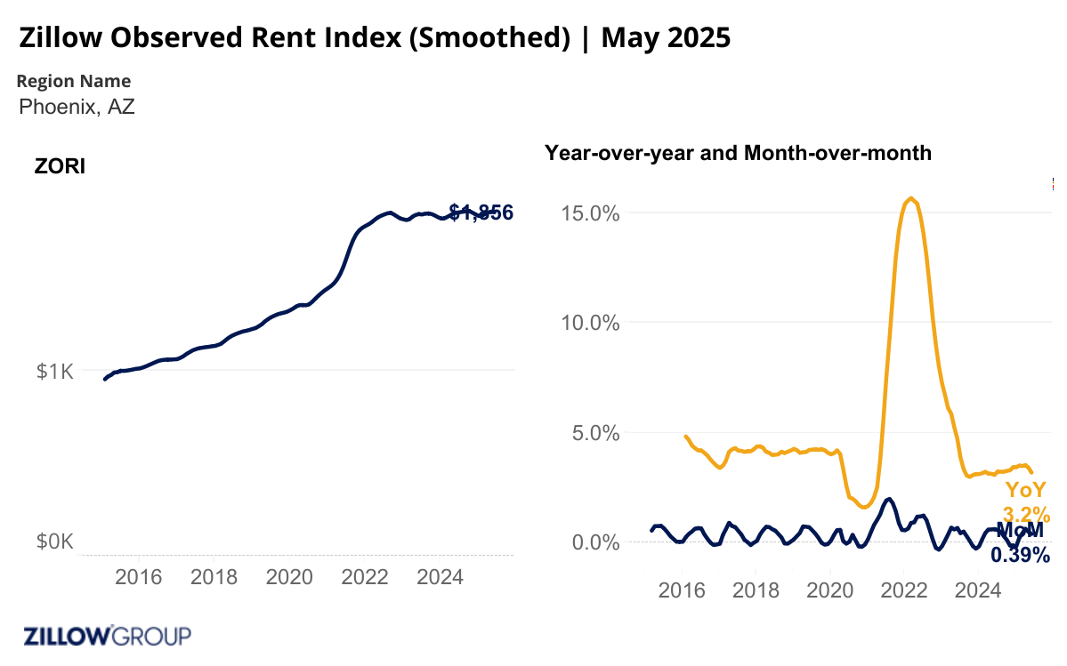 Rental activity and trends for the Phoenix Metro area as reported by Zillow Research – May 2025